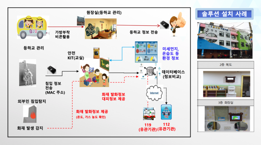 어린이집, 초등학교, 사회적 약자 주거시설등에 설치하여 화재, 외부 침입자 등 감시 및 데이터 분석을 통한 발화지점 통보, 실시간 대피 경로를 제공하며 기타 미세먼지 등 환경정보를 제공합니다.