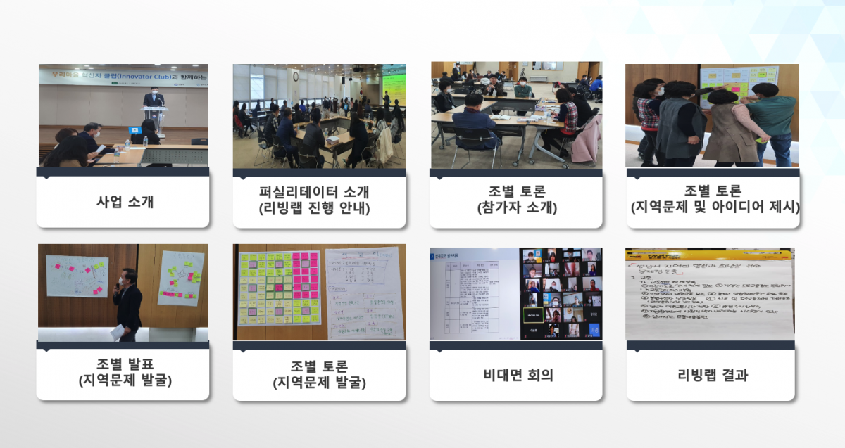 스마트시티의 도시 문제를 해결하기 위한 "우리마을 혁신자 클럽(Innovator Club)"을 구성하여 시민의 창의적인 아이디어 발굴과 솔루션 실증을 통한 리빙랩 행사를 통한 도시문제 해결을 구현합니다.
