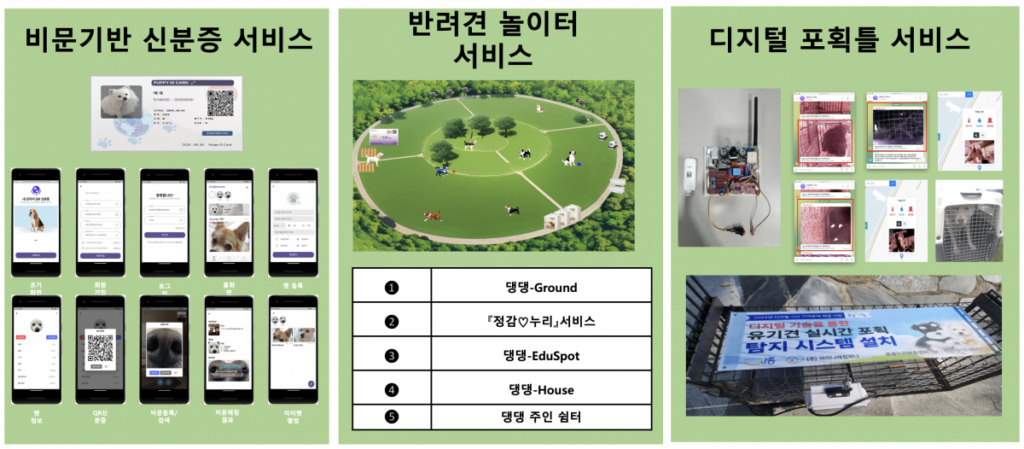 우리 사회는 매년 반려동물과 함께하는 가정은 늘어나는 추세이며 관련 솔루션인 비문(개의 코 주름) 기반 등록 및 신분증 서비스, ICT 기술 접목 반려견 놀이터 서비스, 반려견 데이터 기반 마켓플레이스 서비스, 디지털 포획틀 서비스 등 관련 소프트웨어를 개발 및 보유하고 있습니다.